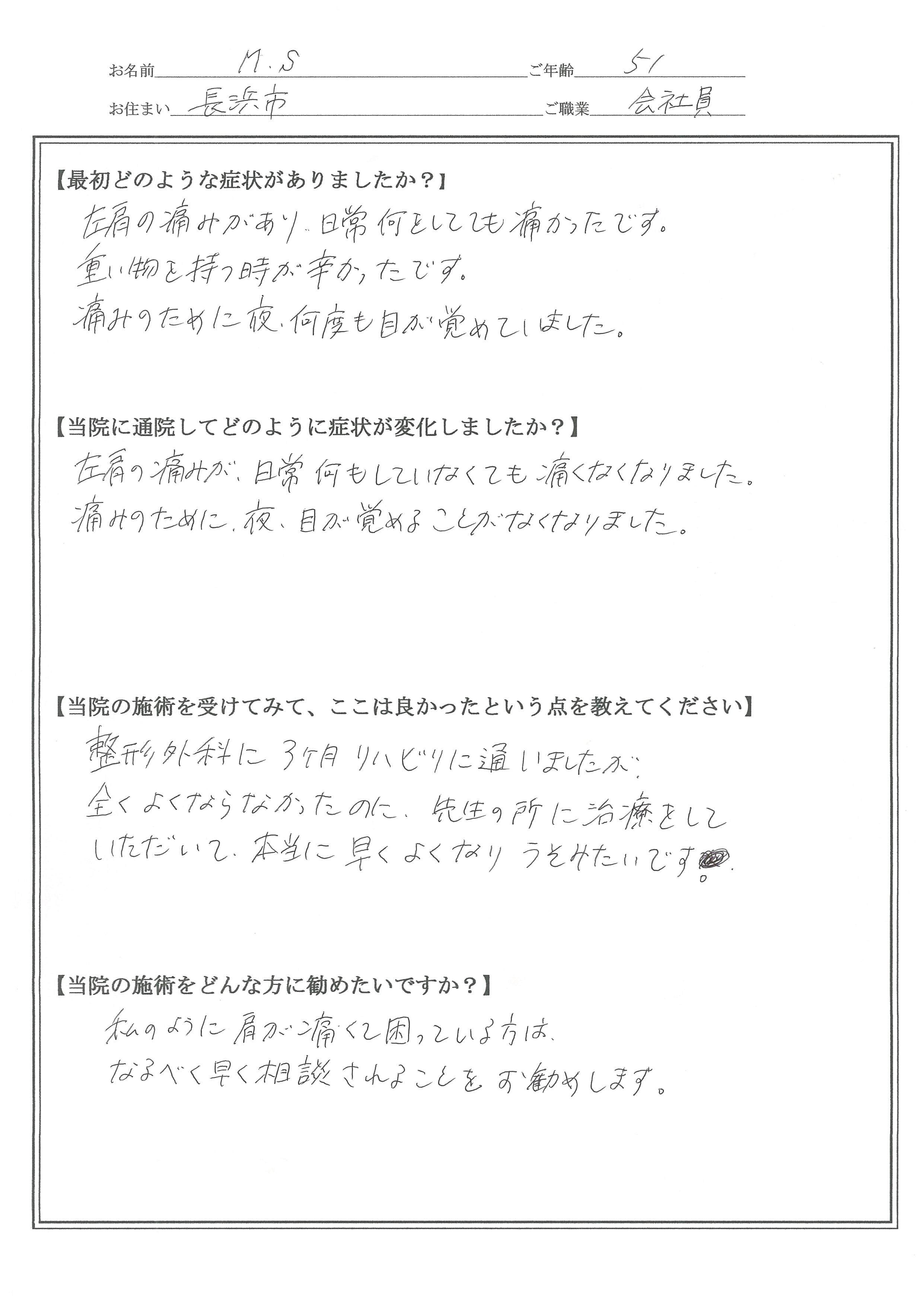 M.Sさん 会社員 51才 腱板炎と診断され、左肩が日常何をしても痛かった、夜、何度も痛みで目が覚めていました