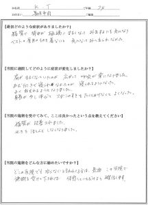【当院の施術を受けてみて、ここは良かったという点を教えてください】先生が治しますとおっしゃったとおりに通院したおかげで本当に治り感謝します。