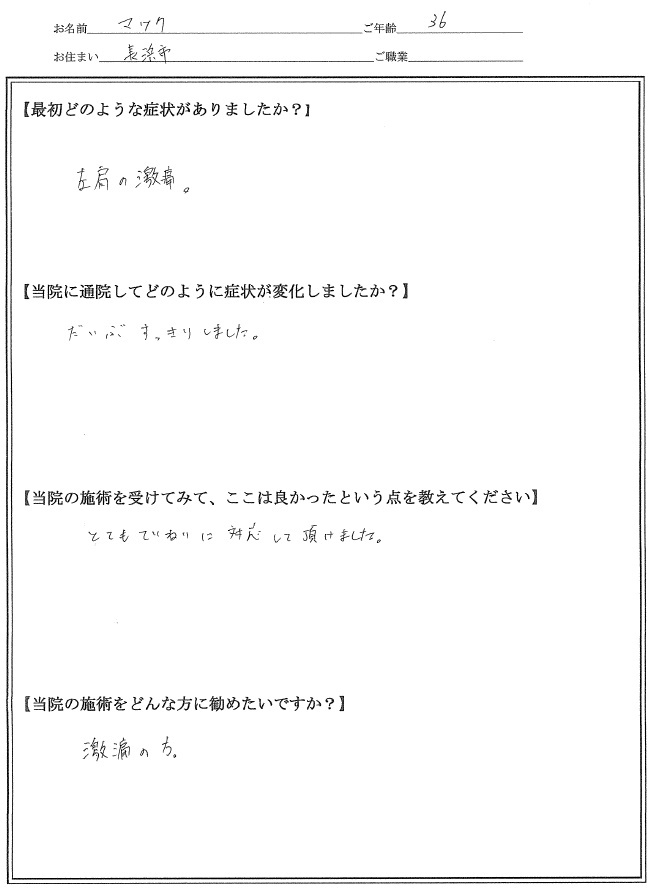 マックさん会社員36歳 四十肩・五十肩 「とても丁寧に対応していただけました!」