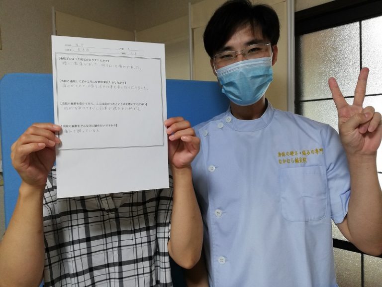 医学的根拠に基づく説明と治療により、ご本人いわく「こんなによくなるものとは思っていませんでした。あきらめなくてよかったです!症状の戻りもなく日常生活が楽に動けています!」